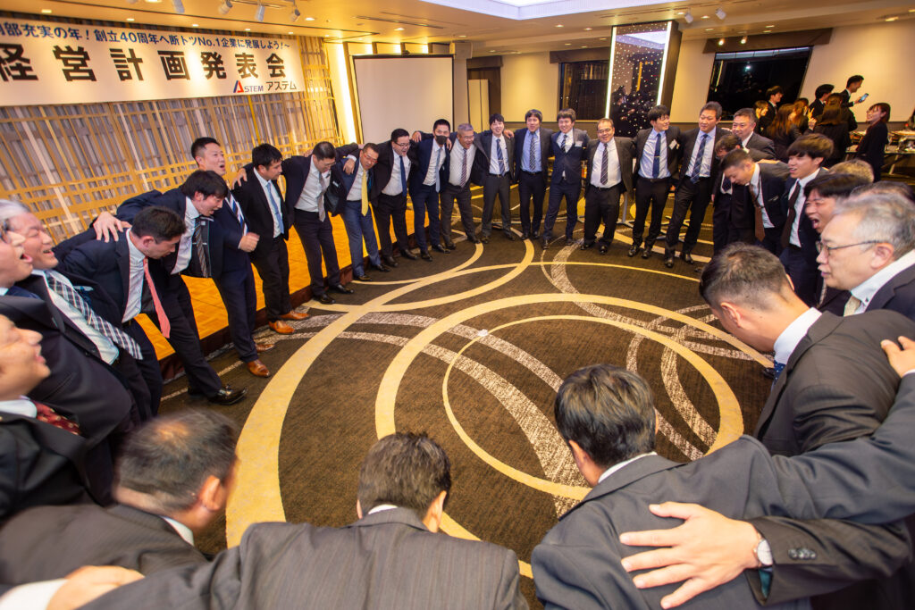 経営計画発表会後に第一ホテル両国にて開催した「第41期 出陣式」では、社員同士で交流を深め、若手社員が企画した「アステム クイズ大会」も大いに盛り上がりました。